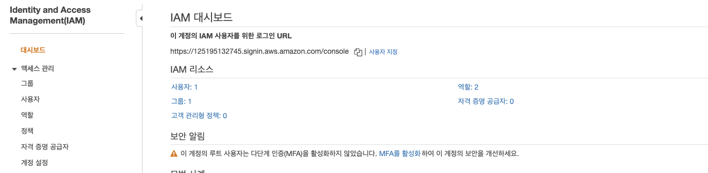 - IAM사용자 로그인 링크 : 이 계정으로 로그인하는 URL